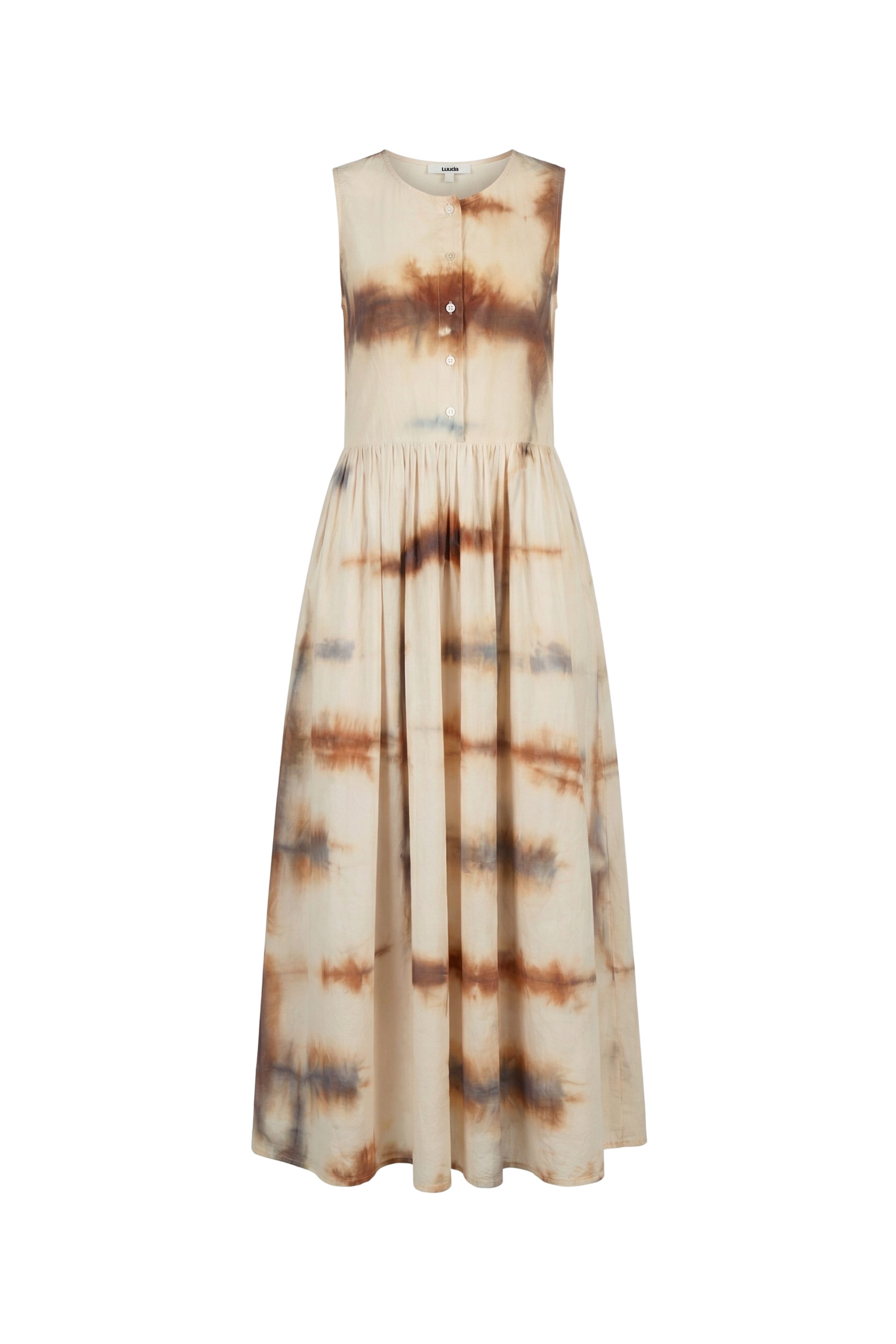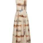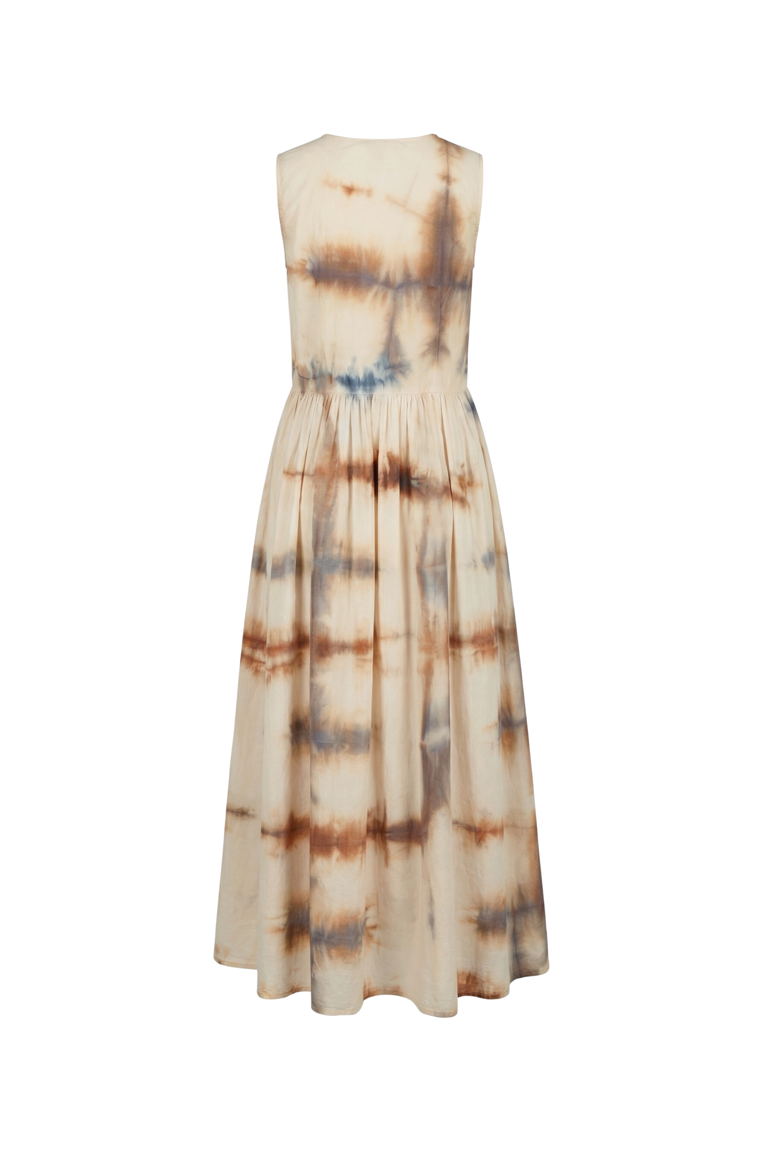 A sleeveless silhouette with a clean bodice and softly gathered skirt.