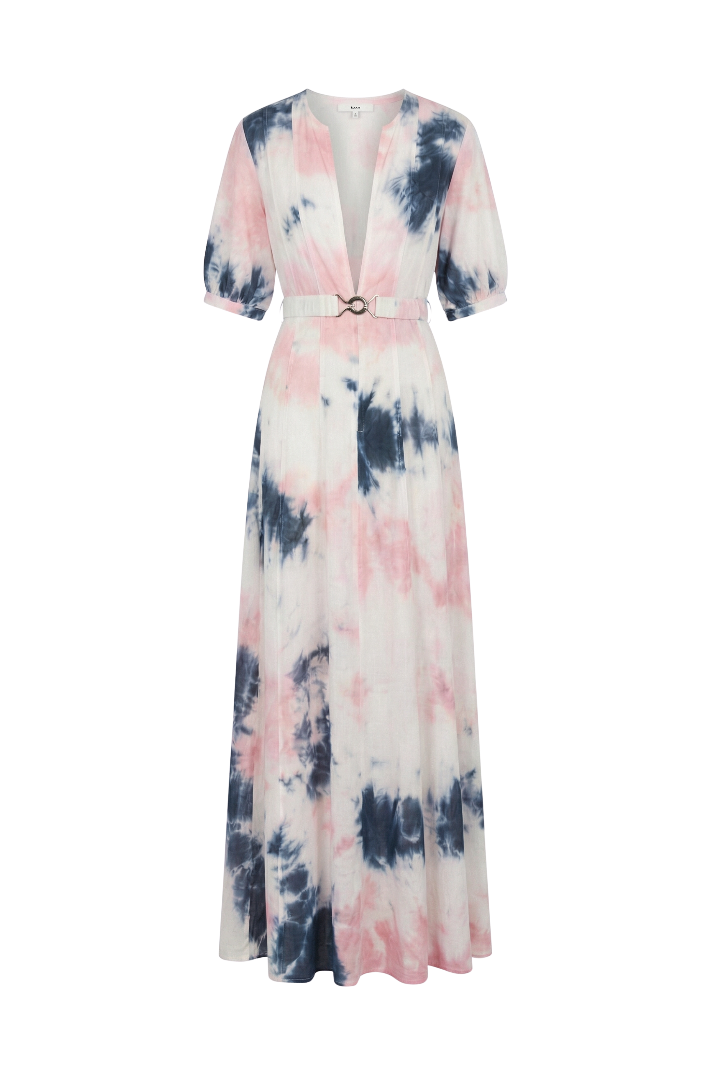 Belted maxi dress with voluminous sleeves and zipper at front.