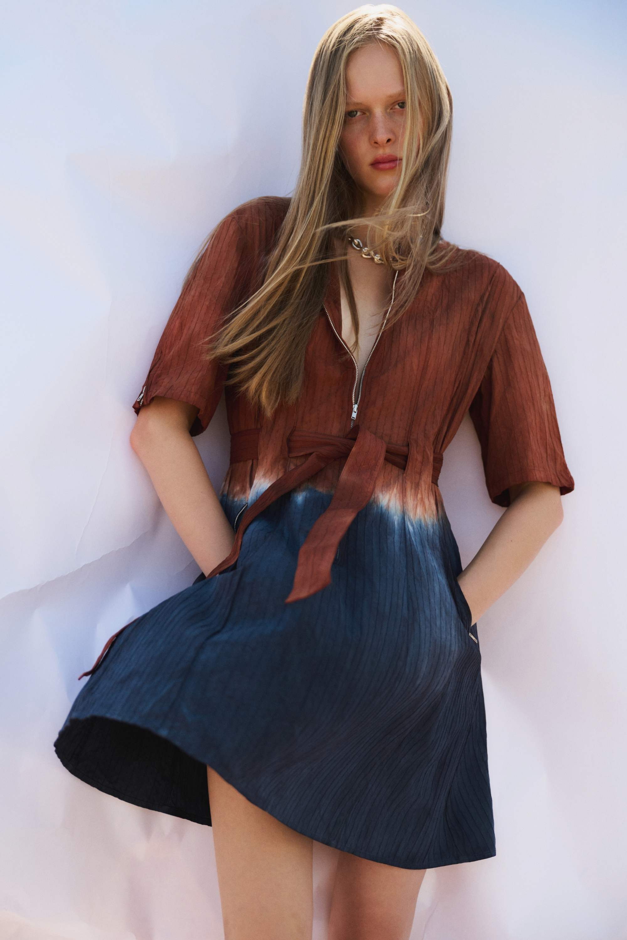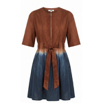 A belted A-line mini dress with zipper detailing, removable waist belt in self fabric and side pockets.